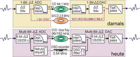 Ein Blick auf den Signalfluss der AD- und anschließenden DA-Wandlung mit den alten 1-bittigen ΔΣ DAC Converter verrät, dass an den Ausgängen der ΔΣ-Modulatoren auf AD- und DA-Seite äquivalente 1-Bit Signale mit 64-facher Abtastrate erzeugt werden. Hier setzte nun die DSD-Idee an: statt Filterung und Dezimierung auf der AD-Seite der DAC Converter und anschließendem Oversampling und erneute Umsetzung auf 1 Bit im DAC lässt sich das Ausgangssignal des AD-seitigen Sigma-Delta-Modulators anzapfen und direkt auf die Switched Capacitor-Schaltstufe des DAC führen. Genau dieses 1-Bit-Zwischensignal mit 2.8224 Mb/s pro Kanal der frühen ΔΣ-Audio-Converter für die Standradrate wird auf der SACD gespeichert, welche von Sony/Philips nach dem politisch begründeten Rückzug aus dem DVD-A Konsortium als qualitativ hochwertigerer Nachfolger der CD erkoren wurde.