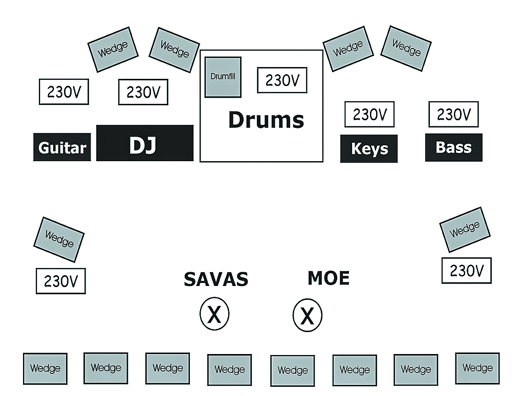 Der rein informative Charakter des Stage Riders kann wie folgt aussehen: „Hallo, wir sind die Formation XY und spielen mit fünf Musikern in folgender Besetzung. Wir kommen mit kompletter eigener Backline, aber ohne eigenes Personal.“ Zusammen mit einer Input-Liste, aus der alle Details der benutzten Instrumente herauszulesen sind und einer groben Zeichnung der Bühnenpositionen ist der Band Rider fertig. Er passt auf einen DIN-A4-Bogen und enthält alle wichtigen Informationen.