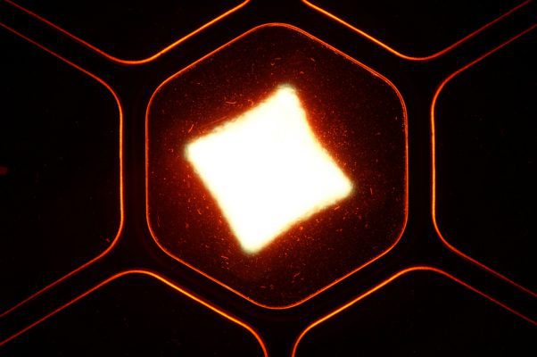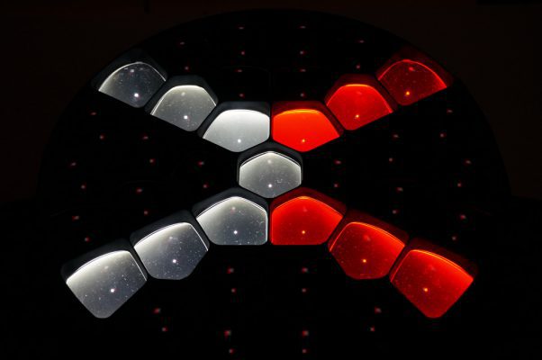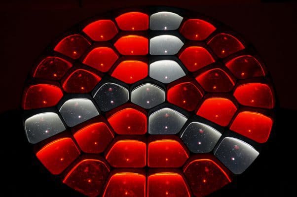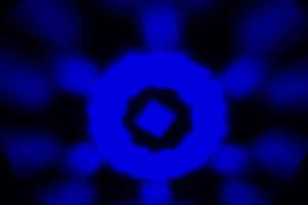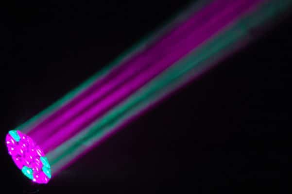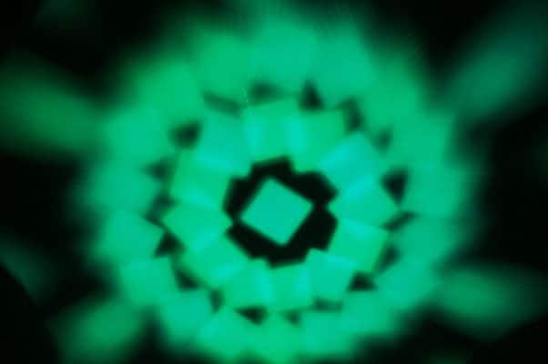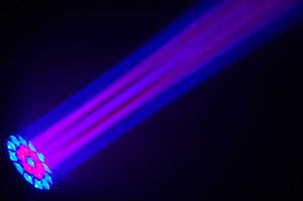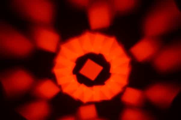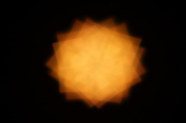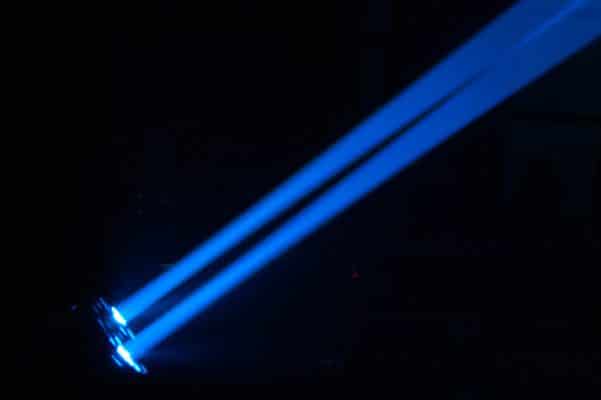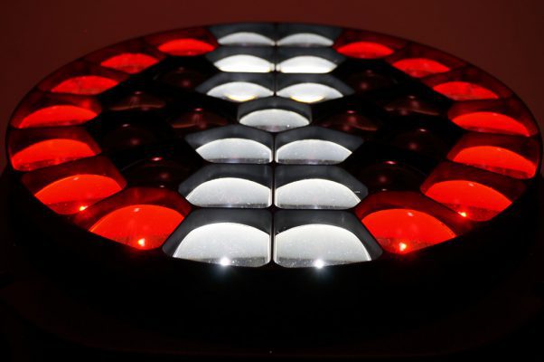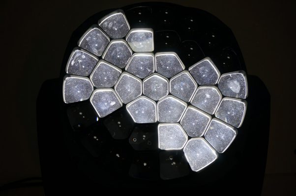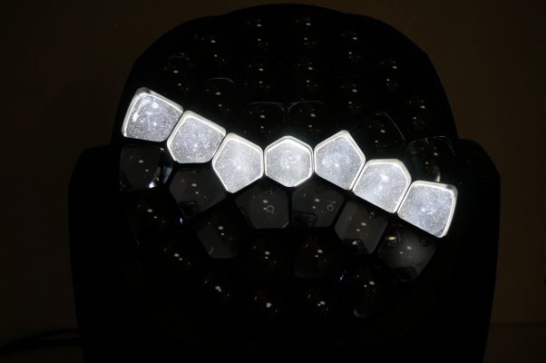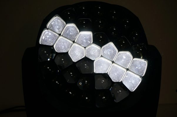 Neben den Optiken selbst sind es vor allem die Bewegungen der Frontlinse, die aus obigem Wash Light das Plus an kreativen Möglichkeiten herausholen. Bewegt man die Linsenplatte entlang der optischen Achse, erhält man einen mächtigen Zoombereich mit Abstrahlwinkeln von 4° bis 60°, womit großflächige Illuminationen einerseits, aber auch kraftvolle, nahezu parallele Beams sowie alle Facetten dazwischen darstellbar sind und aus einem vormals reinen Washlight einen Beam-Wash-Hybriden machen. Noch interessanter aber sind die Bewegungen um die eigene Achse, also die Rotation der Frontlinse. Die Verschiebungen von LED zu Optik bricht die homogene Gesamtmischung auf und erzeugt viele einzelne „Mini-Beams“, die je nach Rotationsposition unterschiedlichste Muster im Raum oder bei Projektion erzeugen. Die Linse ist dabei analog einem Prisma sowohl indizier- als auch in verschiedenen Geschwindigkeiten rotierbar. Abseits ihrer Home-Position können die Optiken allerdings nicht mehr über die LEDs gefahren werden, weshalb der Zoom hier auf wenige Grad innerhalb des eng abstrahlenden Bereiches beschränkt ist. Was im ersten Moment nachteilig klingt, ist jedoch in der Praxis kaum von Bedeutung, da ein effektvolles Aufspalten nur bei nahezu parallelen Beams sinnvoll ist. Der Zoom bleibt dabei gegenüber der Linsenrotation stets priorisiert, das heißt ein Abstrahlwinkel jenseits des Grenzwertes stoppt oder verhindert gar die Nutzung des Rotationseffektes. Um die Effektvielfalt der rotierenden Linse voll ausspielen zu können, muss jeder Beam für sich möglichst deutlich und klar definiert sein. Aus diesem Grund bildet der Clay Paky A.Leda B-EYE im eng abstrahlenden Bereich den LED-Emitter beinahe rechteckig fokussiert ab, was einerseits markante Einzel-Beams und wunderschöne kaleidoskopartige Projektionseffekte ermöglicht – auf der anderen Seite aber auch die bereits erwähnten, sehr dezent vorhandenen Unreinheiten bezüglich Farbmischung und Intensitätsverlauf bei geschlossenem Beam mit sich bringt.
