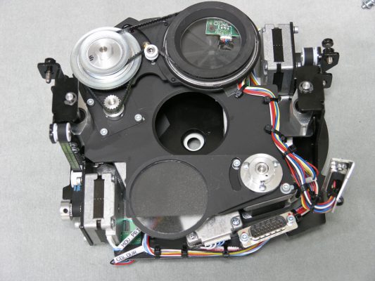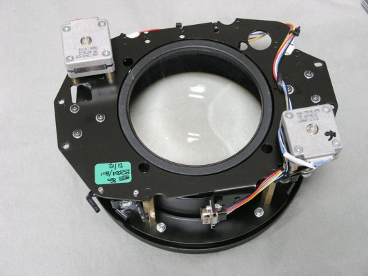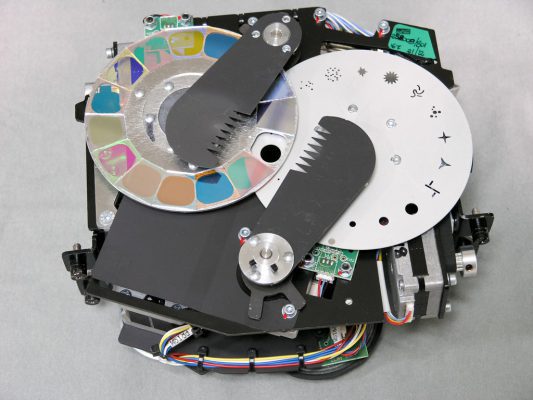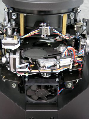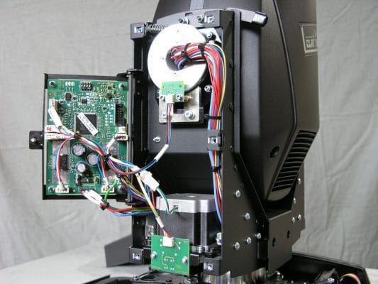 Im Innern des Kopfes geht es eher eng zu. Dennoch wirkt die Verarbeitung hochwertig, alle Leitungen sind ordentlich beschriftet und die optischen Komponenten modular aufgebaut. Durch das Lösen von wenigen Schrauben kann zuerst die große Linseneinheit vorne am Kopf und dann das Modul mit den restlichen Bauteilen wie Farb- oder Goborad entnommen werden, um diese z. B. zu reinigen. Alle elektrischen Leitungen zu den Modulen laufen dabei zentral über drei Sub-D-Steckverbindungen. Farb- und Goborad werden magnetisch gehalten und lassen sich so sehr einfach entnehmen. Der Ausbau des Brenners gestaltet sich etwas schwieriger, aufgrund seiner langen Lebensdauer ist das aber auch nicht so oft notwendig. Gekühlt wird der Kopf mittels eines Axiallüfters und eines Radiallüfters, der nur für das Leuchtmittel zuständig ist.