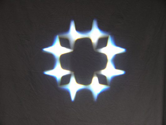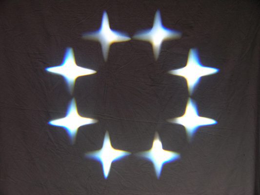Ein Beamlight dient dazu, möglichst helle und interessante Gegenlichteffekte zu erzeugen und nicht etwa Gobos zu projizieren oder Flächen und Gegenstände auszuleuchten. Dies wäre mit diesem Scheinwerfer aufgrund des Öffnungswinkels von maximal 3,8° auch schwierig bzw. schlichtweg nicht möglich. Der Kopf des Sharpy bewegt sich sehr schnell und kraftvoll. Alle Positionen wer den exakt angefahren und die Bewegung ist auch bei langsamster Fahrt sauber. Beim Dimmen sieht man, wie die gezackten Shutterklappen von außen in den Beam fahren. Es ist sogar möglich, die Klappen mit dem Fokus scharf zu stellen. Den starken Hotspot bei offenem, fokussiertem Lichtkegel werten wir durchaus als Vorteil, wenn es darum geht, fette Beams zu erzeugen. Die Abbildung der Gobos ist recht scharf und fast ohne die roten und blauen Ränder, die man oft bei Scheinwerfern dieser Gattung sieht. Die Auswahl der elf Gobos (die Lochblenden nicht mitgezählt) halten wir für absolut gelungen. In Kombination mit dem Achtfach-Prisma und der Möglichkeit, die Größe des Effekts durch Verschieben dieses Prismas im Strahlengang zu verändern, lassen sich sehr interessante Effekte erzeugen. Die Rotation des Prismas ist selbst bei langsamster Geschwindigkeit absolut ruckelfrei. Mit den verschieden großen Lochblenden auf dem Goborad lässt sich der Öffnungswinkel des Beams in sechs Stufen verkleinern. Dabei wird der Lichtstrahl außen abgeschattet und nur der extrem helle Hotspot durchgelassen. Das Ergebnis sind sehr massiv wirkende, parallel laufende Beams, die bei kleiner Größe an die Laserschwerter aus Star Wars erinnern. Dabei sucht man die – sonst für Beamscheinwerfer typische – Corona um den Lichtkegel vergebens. Der Frostfilter kann linear in den Beam bewegt werden, sorgt voll eingefahren für einen sehr sanften Hell/Dunkel- Übergang und entschärft den Hotspot des Lichtkegels. Er kann, genau wie das Prisma, im Strahlengang via DMX bewegt werden und wirkt somit ähnlich wie ein Zoom. Pulse-Effekte sind mit ihm leider nicht möglich, was wir etwas schade fanden, würden sie doch die Effektpalette abrunden. Die insgesamt 14 Farben sind gut ausgewählt und werden allesamt kräftig wiedergegeben. Das Erzeugen von zweifarbigen Beams gestaltet sich recht problemlos, da die Stege zwischen den Farbfiltern, wie schon erwähnt, sehr dünn sind.