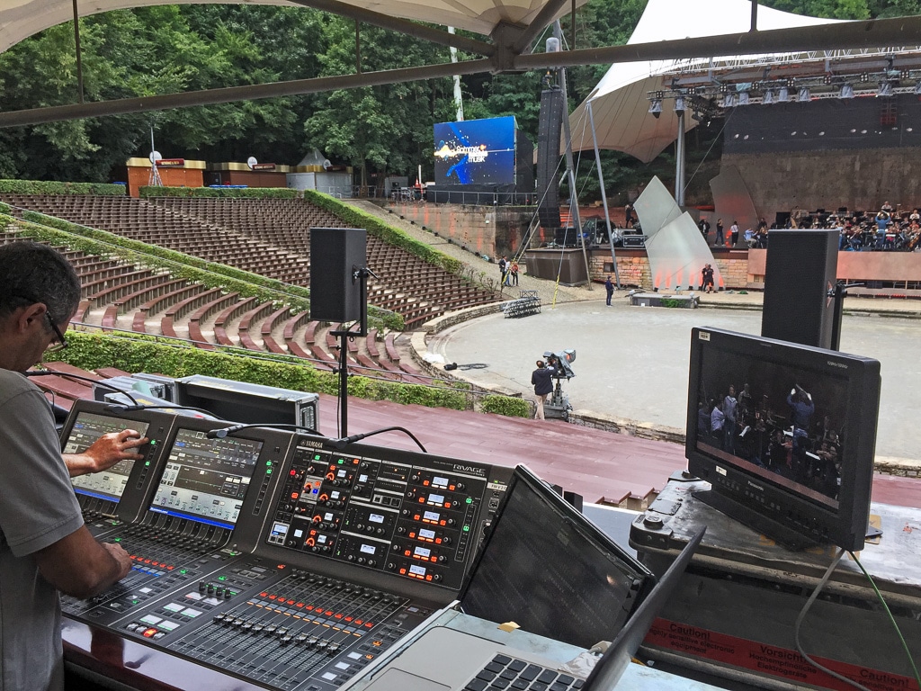 Voraussetzung für die Nutzung eines solchen Systems ist ein Mixsystem, welches genügend Ausspielwege bietet – in diesem Fall 70 bis 80 Busse. Bei Pulten dieser Größenordnung ist die Auswahl überschaubar. Yamaha-Produktspezialist Arthur Koll bemerkt, dass bei der Waldbühnen-Produktion ein Yamaha Rivage PM10 zum Einsatz kam, welches 90 von 108 zur Verfügung stehenden Ausgangsbussen nutzt. Zudem sind weit über 100 Mikrofone im Einsatz. „Unsere CL-Pulte sind für Anforderungen dieser Art nicht mehr groß genug, die Mixwege werden knapp. Die Vernetzung von Pulten ist natürlich möglich, aber hinsichtlich des Workflows nicht unbedingt die optimale Lösung. Zudem bräuchte man einen zu sätzlichen Mann für den Submix“, erklärt Arthur. „Somit hat sich FOH-Mixer Omar Samhoun für unsere neuen Pulte Rivage PM-10 interessiert, die sämtlichen Anforderungen dieses Events gerecht werden.“