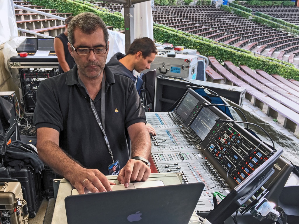 Mittlerweile ein Standard-Feature und natürlich auch bei Yamahas Rivage-Pulten mit an Bord ist die Virtual-Soundcheck Funktion. Omar berichtet: „Aufgrund der Anwohnersituation durften wir bis jetzt (Vormittag der Aufführung, Anm. d. Red.) noch keinen Soundcheck über die PA machen. Somit habe ich gestern eine heiße Probe aufgezeichnet und sie später zum Virtual Soundcheck genutzt. Wir haben dabei ein Paar d&b Y10-Lautsprecher direkt vor dem FoH-Platz positioniert, um PA-Feeling zu bekommen – laut am FoH, leise für die Anwohner … Heute folgt kurz vor der Veranstaltung eine Zwei-Stunden-Probe, bei der ich dann richtig laut machen kann.“