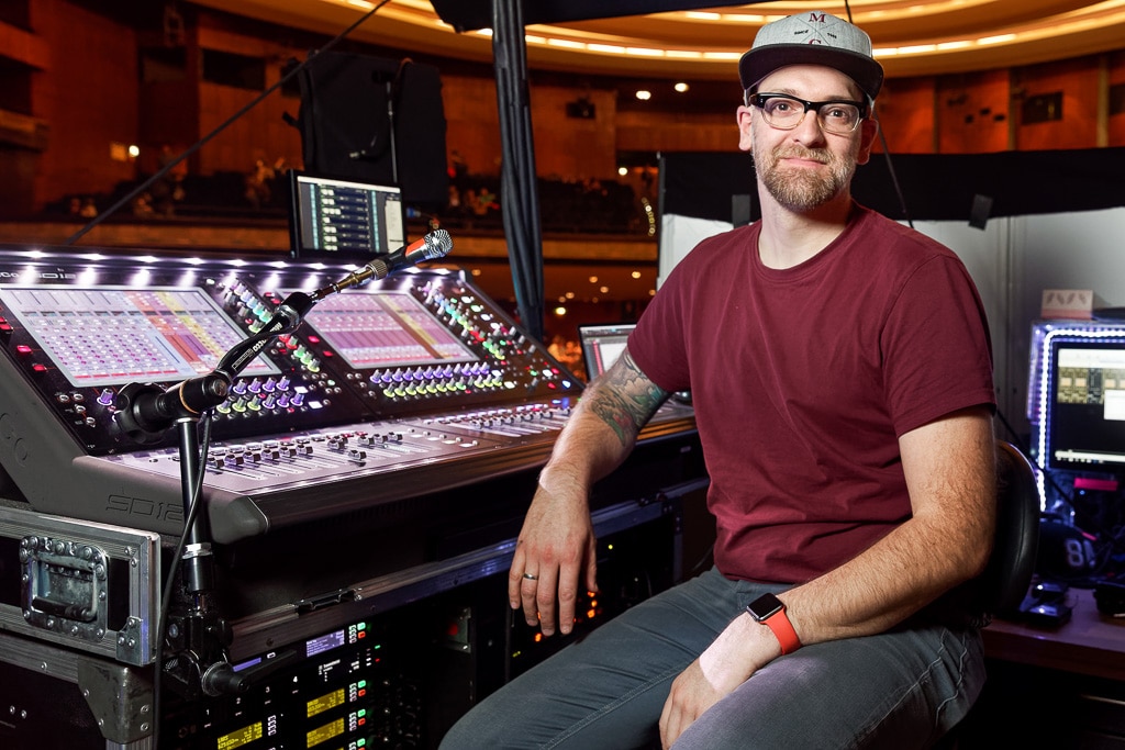 „Jede Klangfabrik wird unabhängig, post Fader und post Processing über Direct-Outs von der SD12 mit jeweils 48 Kanälen beschickt. Pro Gerät stehen vier Output-Mixes für die sechs Musiker, einen Gast und die Backliner zur Verfügung. Dank der neuen Kaskadierung kann ich in der Klang-App mit nur einer übersichtlichen Oberfläche ohne Layer-Untiefen gleich beide Maschinen steuern. Die Mixes werden via MADI in die Merge-Inputs der SD12-Aux-Wege zurückgeschickt, wodurch mir keine Eingänge verloren gehen und ich wie gewohnt am Pult arbeiten und die Mixes abhören kann.“