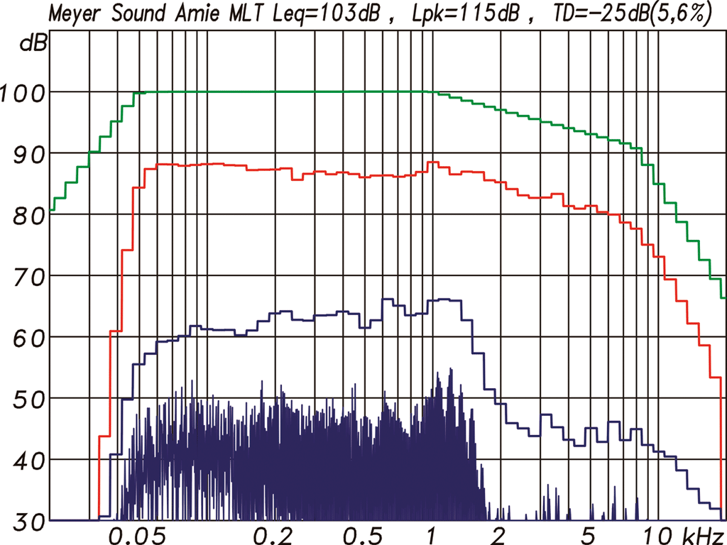 Für das M-Noise-Testsignal mit einem 6 dB höheren Crestfaktor von 18 dB gibt Meyer Sound einen Peakwert für die Amie von 120,5 dB an, was gut mit den 115 dB für das Signal mit 12 dB Crestfaktor zusammenpasst. Für den Amie Sub findet sich im Datenblatt ein Wert von 124,5 dB Peak unter Halbraumbedingungen für ein Signal mit 11,5 dB Crestfaktor. Das von uns verwendete Multiton-Bandpasssignal 20-200 Hz hatte einen Crestfaktor von 10 dB, mit dem für den Halbraum 123 dB gemessen wurden. Auch hier gibt es demnach eine gute Übereinstimmung.
