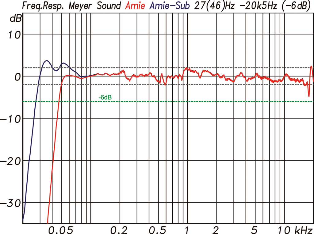 Zusätzlich zum Funktions- und Hörtest mussten sich die Meyer Sound Amie wie immer auch im Messlabor bewähren. Die Messung der Frequenzgänge erfolgte mit Sweep-Signalen in 4 m Entfernung auf der Mittelachse der Monitore. Das Ergebnis ohne jede weitere Glättung zeigt Abb. 3. Die Eckfrequenzen der Amie ohne Subwoofer liegen bei 46 Hz am unteren und bei 20,5 kHz am oberen Ende, wenn man einen 6-dB-Pegelabfall zum Mittelwert zwischen 100 Hz und 10 kHz als Maßstab zugrunde legt.