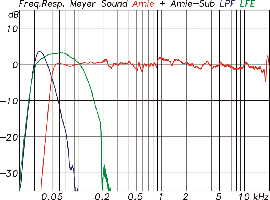 Amie und Subwoofer Amie Monitor (rot) zusammen mit dem Amie-Subwoofer für tiefpassgefilterte Signalanteile aus den Hauptwegen (blau) und für das LFE-Signal (grün, Abb. 5) (Bild: Meyer Sound)
