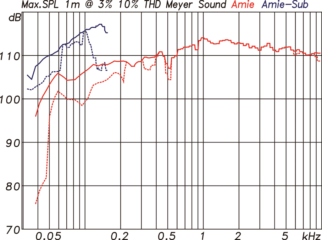 Die gemessenen Pegelwerte sind Mittlungspegel für die Dauer des Burst-Signals, bezogen auf 1 m Entfernung. Da mit einem Sinussignal gemessen wird, liegt der Spitzenpegel in diesem Fall 3 dB darüber. Durchgeführt wurden die Messungen in einem Abstand von 4 m und dann auf 1 m nach dem 1/r-Gesetz (–6 dB pro Entfernungsverdopplung) zurückgerechnet. Für Amie verläuft die gemessene Kurve vorbildlich gleichmäßig. Schwachstellen oder Einbrüche gibt es keine. Dort, wo beide Kurven für höchstens 3% und 10% THD zusammenfallen, wird der Pegel bei maximal 3% Verzerrungen erreicht. Durch den Einsatz des internen Limiters werden höhere Verzerrungswerte verhindert, die sonst durch Verzerrungen der Treiber oder durch Clipping der Endstufen entstehen würden.