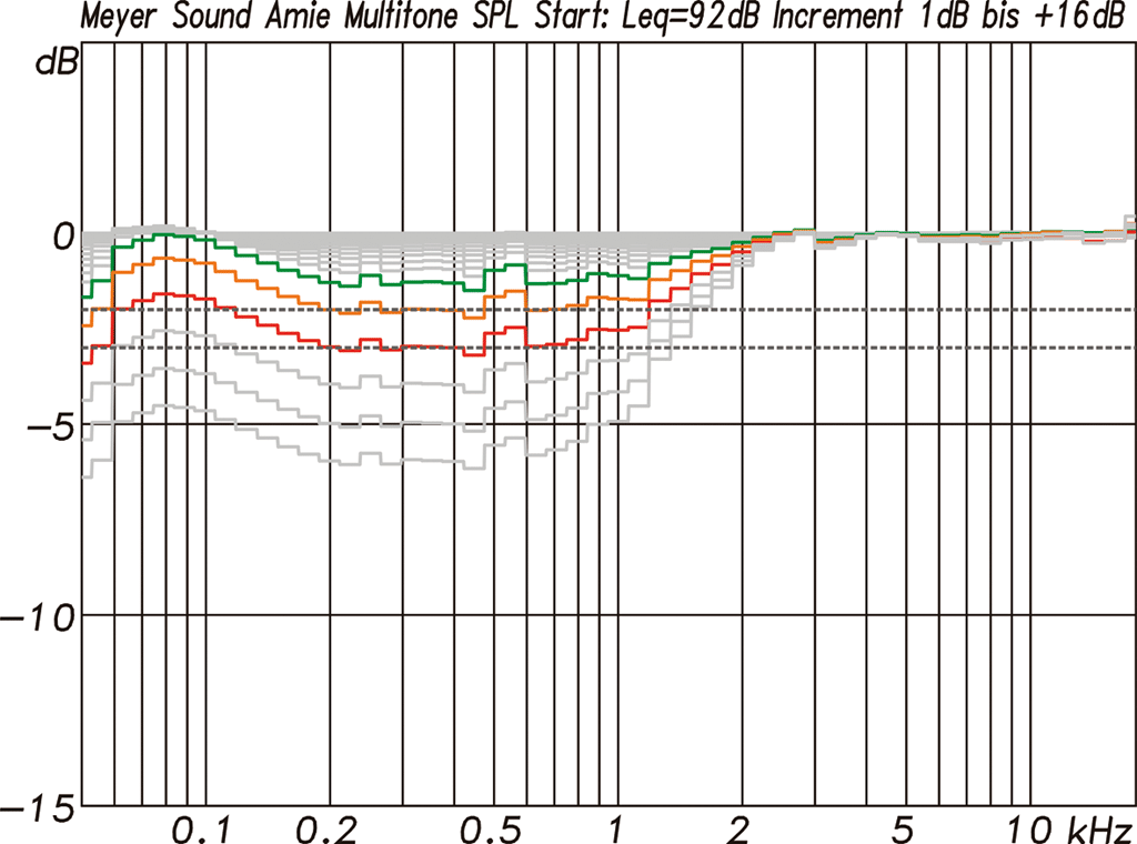 Abb. 10 zeigt die Auswertung der Powercompression für den Amie-Monitor. Vom Startwert mit einem Mittlungspegel von 92 dB ausgehend, wurde der Grenzwert für die Powercompression bei +12 dB (gelbe Kurve in Abb. 10) erreicht. Die dabei gemessenen Spektren zeigt Abb. 11.