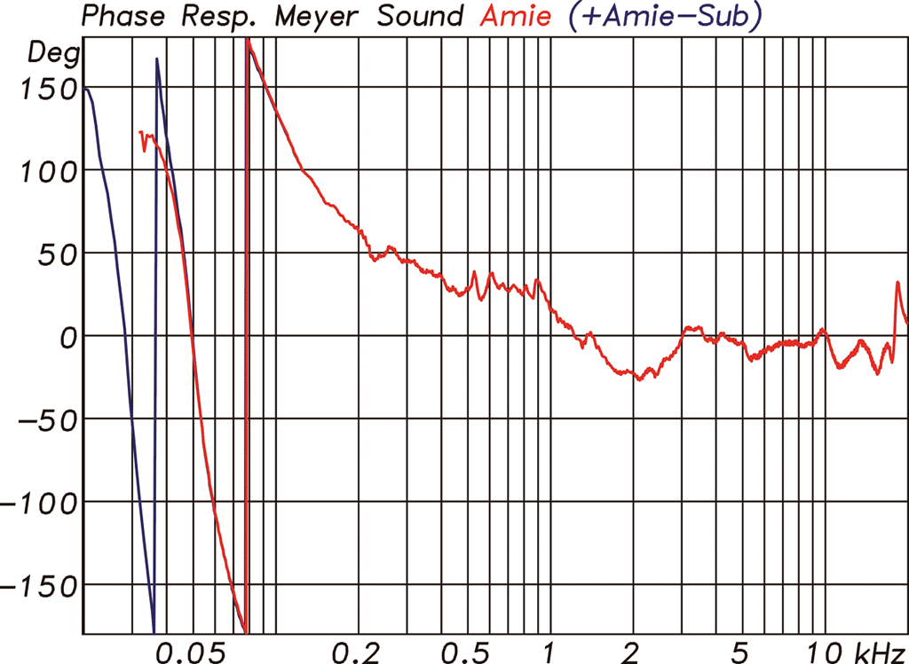 Phasengang Amie-Monitore (rot) und zusammen mit dem Amie-Subwoofer (blau). Der Monitor agiert ab ca. 200 Hz aufwärts weitgehend linearphasig, bei tiefen Frequenzen kommt es durch das Hochpassverhalten und die Ankopplung zum Subwoofer unvermeidlich zu Phasendrehungen (Abb. 4) (Bild: Meyer Sound)