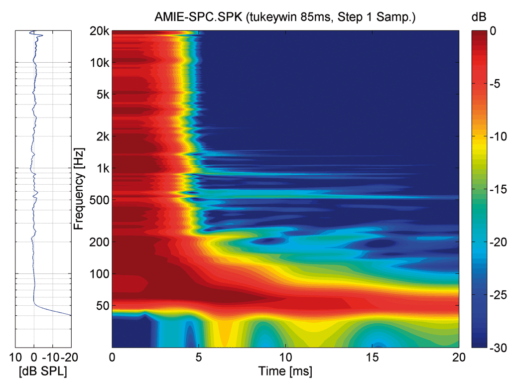 Zum Thema „lineares Übertragungsverhalten“ wäre final noch ein Blick auf das Spektrogramm aus Abb. 6 zu werfen. Das Ausschwingverhalten ist bis auf zwei schmale Resonanzen bei 540 Hz und um 1 kHz makellos. Insbesondere der Hochtöner fällt positiv auf, wo sich die Vorzüge des Konzeptes mit einer Kalotte und Horn gegenüber dem Kompressionstreiber zeigen.