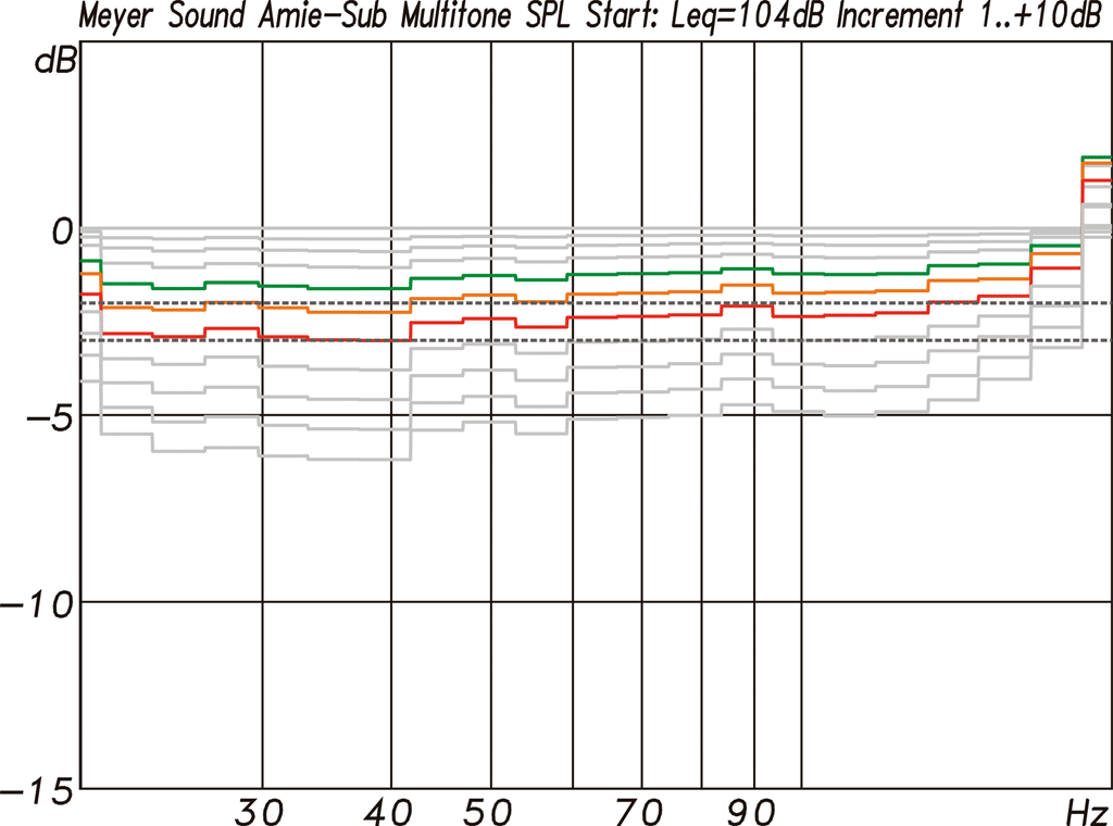 Eine vergleichbare Messung mit einem Multitonsignal wurde auch mit dem Amie Sub durchgeführt. Das Signalspektrum wurde dabei jedoch als Bandpass-Spektrum 20-200 Hz gewählt. Alle 60 Sinussignale für den Multiton liegen zwischen 20 Hz und 200 Hz. Das Kriterium war auch hier wieder eine breitbandige Powercompression von maximal 2 dB entsprechend der gelben Kurve aus Abb. 12. Der so erreichte Mittlungspegel Leq für den Amie Sub beträgt 107 dB und der Spitzenpegel Lpk 117 dB bei –20 dB Gesamtverzerrungen (TD = THD+IMD). Beide Werte beziehen sich auf 1 m Entfernung im Freifeld unter Vollraumbedingungen (4π).