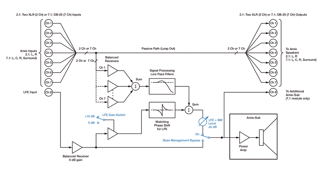 Das vorab genannte Bassmanagement ist im zum Amie-System gehörigen Subwoofer bereits eingebaut. Anhand der Input-Module kann man den Amie Sub mit einem Bassmanagement für 2.1- oder für bis 7.1-Systeme ausstatten. Das Blockschaltbild in Abb. 1 zeigt den Aufbau der 7.1-Variante.