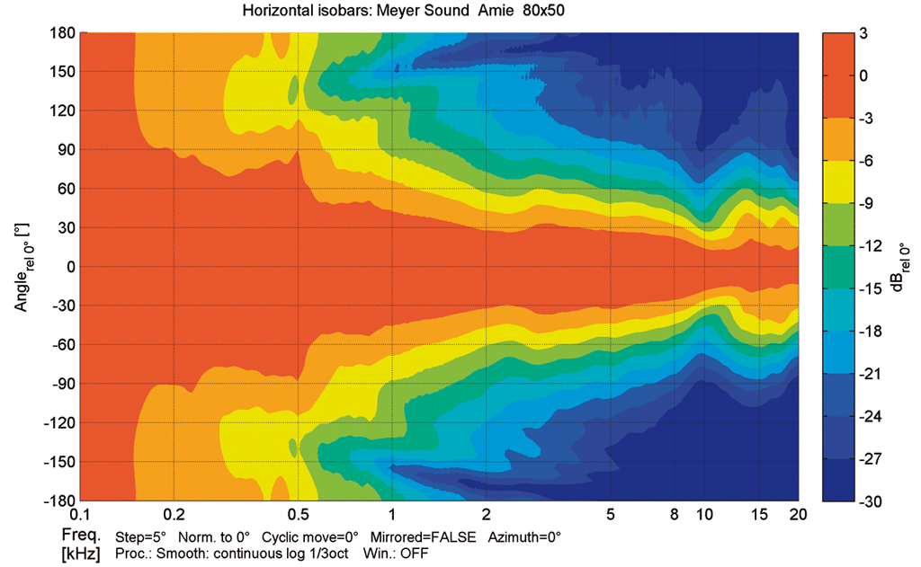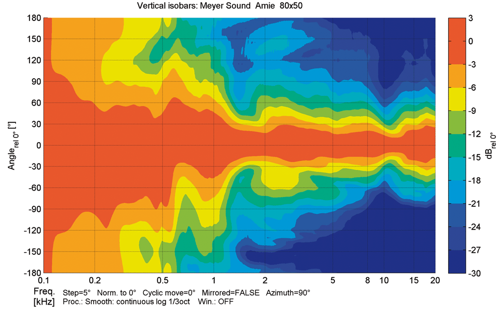 Vertikale Isobaren Meyer Sound gibt zur Amie einen nominellen Öffnungswinkel von 50 an, der ab ca. 1,3 kHz aufwärts weitestgehend eingehalten wird (Abb. 8) (Bild: Anselm Goertz)