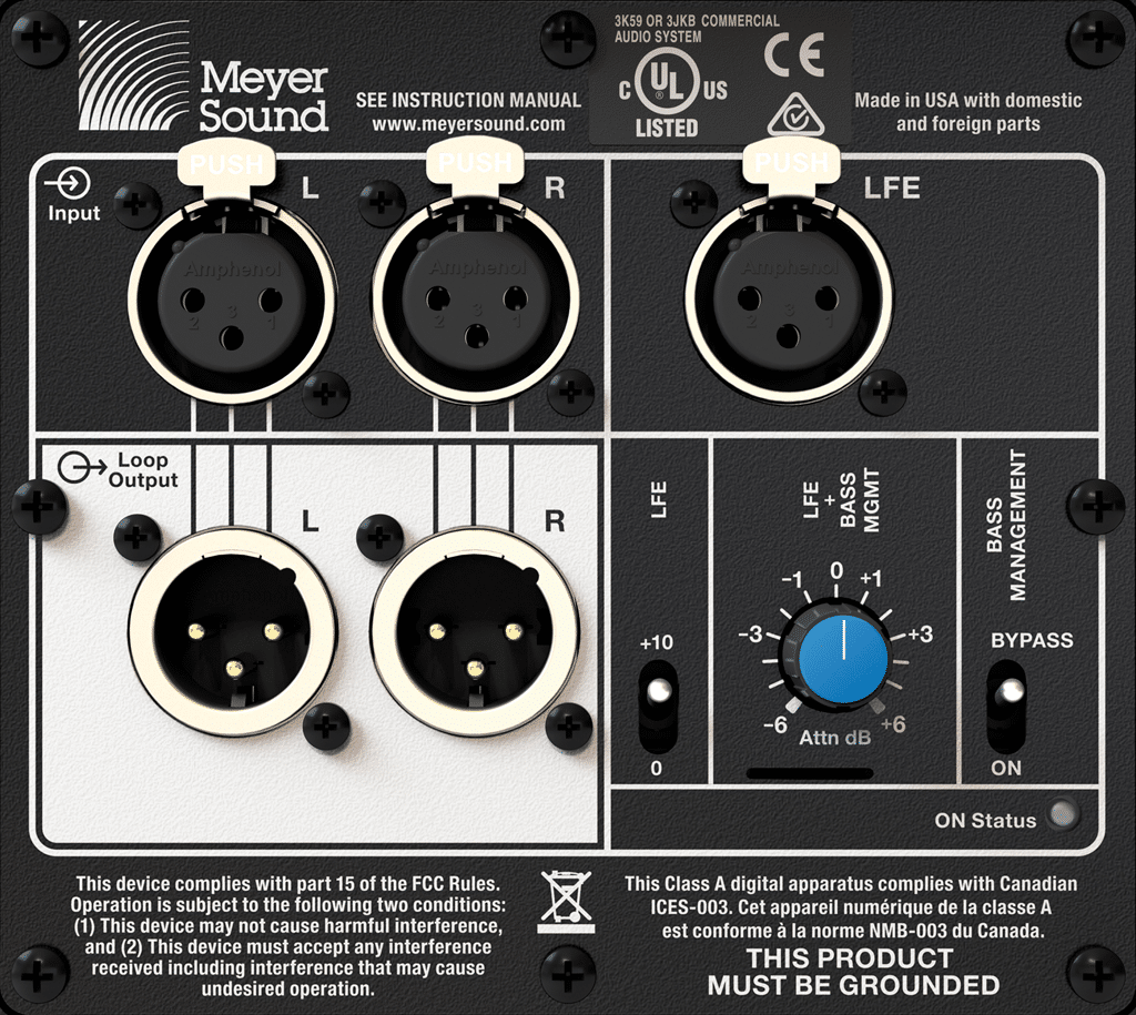 Amie-Sub 2.1 Modul Eingänge und Link-Buchsen für die Topteile und einen LFE Eingang, der exklusiv oder über ein Bass-Management genutzt werden kann (Abb. 2) (Bild: Meyer Sound)