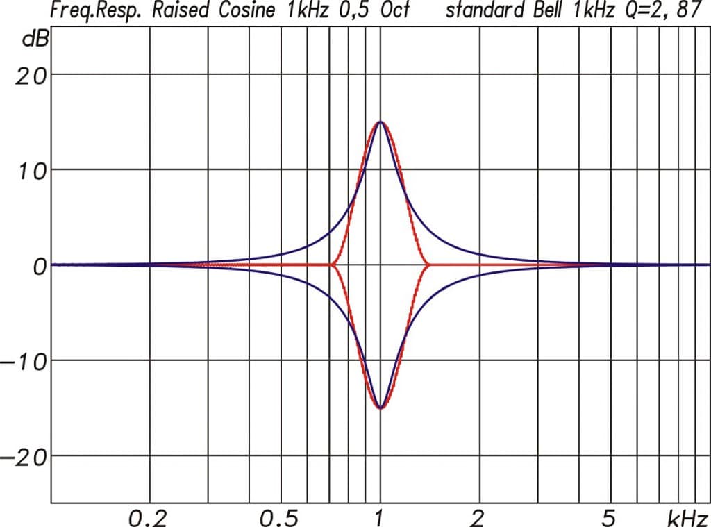 Das Beispiel aus Abb. 2 verdeutlicht die Zusammenhänge. Die Einstellung 0,5 Oct. bedeutet eine Breite der ansteigenden und abfallenden Flanke von jeweils 0,5 Oct. Für eine Mittenfrequenz von 1 kHz beginnt das Filter somit exakt bei 707 Hz und endet bei 1,41 kHz. Ein Überschwingen o. Ä. gibt es auch hier nicht. Zum Vergleich ist in Abb. 2 noch ein herkömmliches Bell-Filter mit 0,5 Oktaven Bandbreite abgebildet, wo man die Unterscheide deutlich erkennt. Wie auch für die anderen Filtertypen gilt hier, dass sich mit dem Raised Cosine Filter die gewünschten Einstellungen präzise umsetzen lassen und die Filter sehr genau dem gewünschten Verlauf entsprechen.