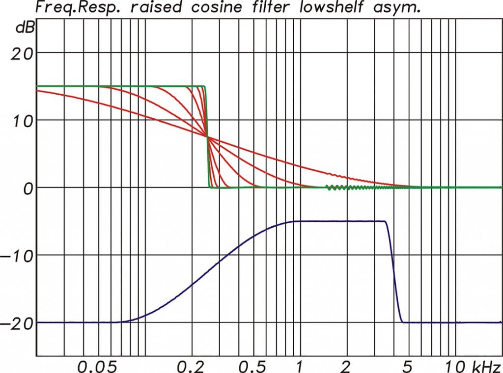 Abb. 1: Raise Cosine Filter, oben ein LowShelf Filter mit flexibler Falnke und unten ein asymmetrisches Filter mit zwei frei einstellbaren Flanken, Welligkeiten gibt es auch bei sehr steilen Flanken bei diesem Filtertyp nicht (Bild: Anselm Goertz)