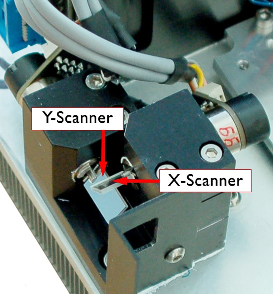 Gleichgeblieben ist die Art der Strahlablenkung an der Geräteöffnung: hier sitzt die Scannereinheit, die durch zwei Mikrospiegel die Ablenkung in den zwei Achsen X und Y erzeugt. Diese Spiegel sind zur Erreichung der extrem hohen Bewegungsgeschwindigkeiten möglichst klein, um die zu bewegende Masse gering zu halten. Sie werden mit magnetbasierenden Galvanometerantrieben – daher korrekterweise als Galvanometerscanner oder umgangssprachlich als Galvos bezeichnet – bewegt.