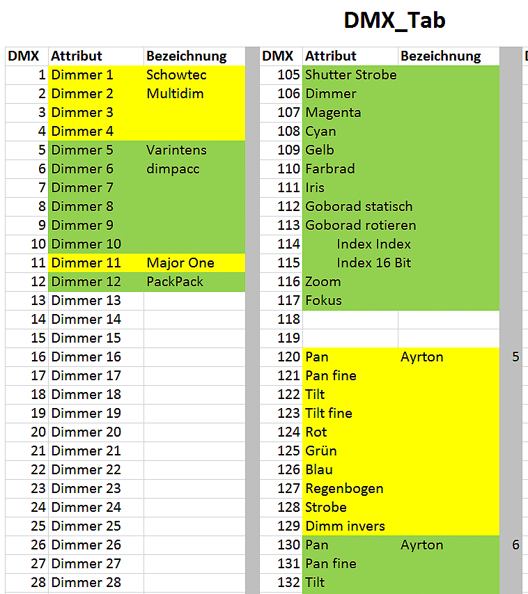 Einige Kollegen gehen beim Patchen immer nach Schema F vor, indem sie die Dimmerkreise von 1 aufwärts belegen … meist bis 48 Kreise, gefolgt von den Moving Lights beginnend mit einer 100er-Adresse. Dann lassen sie zwischen den Moving Lights, wenn genügend DMX-Kreise zur Verfügung stehen, immer ein wenig Platz, sodass sie mit einer neuen 10er Adresse starten können, wie z. B. 120, 140, 160 … das erleichtert das Adressieren der Scheinwerfer, weil man sich das einfacher merken kann wie 125, 138 … Dann geben sie der Nebelmaschine meist den Kreis 512 und das Strobe erhält 510 und 511. Das ist dann immer leicht zu merken und man bekommt leicht Routine.