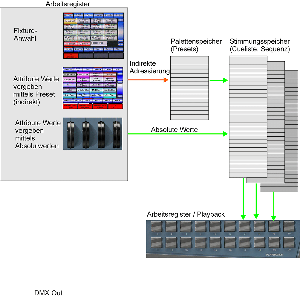 Um mit den Scheinwerfern ein Szenenbild zu erstellen, kann man in der Regel die Lampe mittels Tastendruck oder Zahlen-ID anwählen und mittels Encoder die Funktionen wie Dimmer, Farbe, Pan und Tilt usw. einstellen. Da oftmals viele Lampen das Gleiche machen sollen, fasst man mehrere Scheinwerfer zu einer Gruppe zusammen. So spart man sich das Anwählen jeder einzelnen Lampe, da mit dem Gruppenaufruf alle darin befindlichen Geräte angewählt sind.