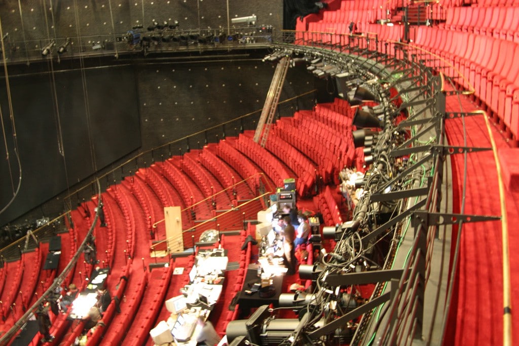 Zuschauerraum – zu sehen sind die Rinnen und der Vorbühnenzug
