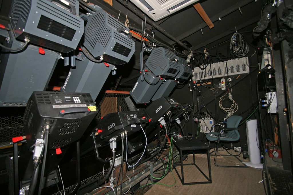 Oftmals ist die Lichtregie unmittelbar in der Nähe des Projektorraumes, manchmal ist es derselbe Raum. Der Projektorraum beinhaltet einen Projektor bzw. Videobeamer oder auch Verfolger. Der Raum ist so platziert, dass die Lichtachse des Projektors senkrecht mittig auf den Horizont fällt, damit möglichst keine Verzerrungen der Projektion auftreten. Zwar kann man bei Videoprojektoren mit Keystone-Einstellungen eine Verzerrung durch schrägen Einfall ausgleichen, was aber bei elektronischem Keystone auf Kosten einiger Pixel geht. Vom Projektorraum kann der Verfolger in der Regel auch jede Person auf der Bühne erreichen. Wenn der Projektorraum einen eigenen Brandabschnitt zum Zuschauerraum bildet, ist die Glasscheibe, die zur Abtrennung dient, immer für Lichtverlust verantwortlich. Auf der anderen Seite werden die Betriebsgeräusche vom Projektor zum Publikum hin unterdrückt. Je nach Leuchtmittel und Temperaturentwicklung werden in Projektorräumen noch Klimaanlagen und Abluft benötigt. Der Projektorraum dient dem Frontallicht.