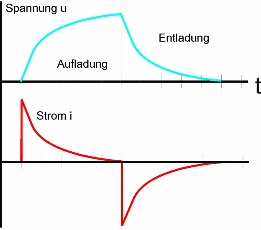 Für das Aufladen benötigt der Kondensator Zeit: Im ersten Moment schießt der Strom in die Höhe um dann immer weiter in einer E-Funktion kleiner zu werden. Dabei wurde 63% als Ladungs- oder Entladungszeit als eine Zeitkonstante Tau τ definiert. Nach fünf Zeiteinheiten ist kaum noch eine Entladung bzw. Aufladung vorhanden, denn nach der E-Funktion nähert sich die Kurve der X-Achse zwar immer weiter an, kommt aber dort nicht zum Erliegen. Die Zeitkonstante τ ist das Produkt aus Widerstand und Kapazität.