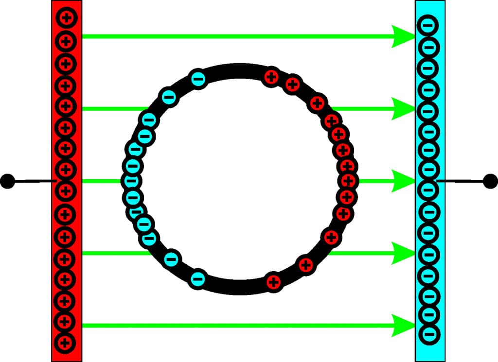 Eine Folge davon, dass freie Ladungsträger durch ein elektrisches Feld beschleunigt werden, ist die Influenz. Darunter versteht man, dass in einem elektrisch leitenden Körper, wie z. B. einer Hohlkugel, Ladungsträger verschoben werden und damit die Hohlkugel ebenfalls elektrisch polarisiert wird. Die Stärke der Polarisation wirkt genau dem Feld entgegen.
