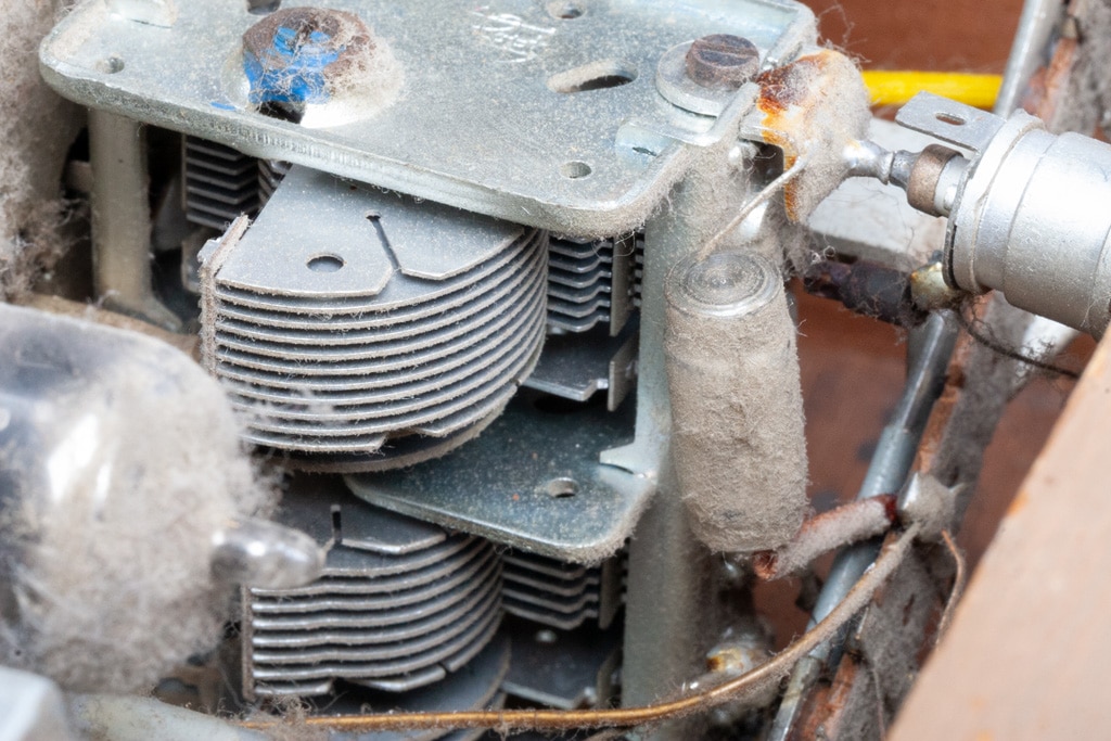 Variable KapazitätDie Platten werden durch Drehung in die Stator-Platten hineingedreht um damit die Kapazität zu ändern. So hatte man einen Schwingkreis auf eine bestimmte Frequenz gedreht (aus einem alten Röhrenradio) (Bild: Herbert Bernstädt)