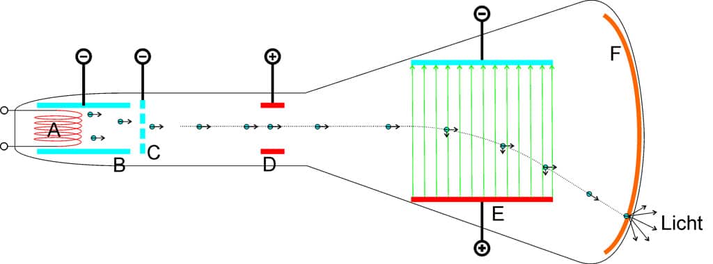 Braunsche RöhreGrundprinzip zur Strahlablenkung (z. B. Oszilloskop): A: Die Heizspirale emittiert freie Elektronen B: Der Wehneltzylinder stößt mit seiner negativen Ladung die Elektronen ab, um sie in der Mitte der Bahn zu fokussieren. C: Das Gitter wird mit Elektronen geladen, um den Strahl zu „dimmen“ bzw. zu verdunkeln. D: Die Ringanode sorgt mit der positiven Polarität für eine Beschleunigung der Elektronen. Die Höhe der Geschwindigkeit hängt dabei von der Beschleunigungsspannung und der Entfernung zwischen A und D ab. E: Der Ablenkkondensator lenkt den Elektronenstrahl entsprechend der Höhe der angelegten Spannung ab. F: Die Elektronen treffen auf eine Phosphorschicht am luftleeren Kolbenglas, welche dadurch angeregt Licht emittiert. Bei einem Oszilloskop sorgt ein zweiter Ablenkkondensator für den zeitlichen Verlauf, indem dort eine Sägespannung aufgelegt wird. Der Rücklauf des Lichtstrahls wird durch eine Steuerspannung am Gitter C verdunkelt. Nun kann der zeitliche Verlauf der Spannung, die am Ablenkkondensator E anliegt, sichtbar gemacht werden. (Bild: Herbert Bernstädt)