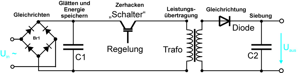 Grundprinzip eines SchaltnetzteilsDie Kapazität im Zwischenkreis sollte so groß sein, dass genügend Energie gespeichert werden kann, damit immer genügend Spannung für eine konstante Ausgangsspannung vorhanden ist – egal wie stark die Eingangsspannung schwankt. Deshalb können moderne Schaltnetzteile auch Eingangsspannungen im Bereich von 90-240 V gut verarbeiten. Mit dem Zerhacken wird eine höhere Frequenz erzielt, so dass (wie wir von den Induktivitäten bereits wissen) der Transformator sehr klein gehalten werden kann. Dann erfolgt noch einmal ein Gleichrichten und eine Siebung, dann steht die konstante Ausgangsspannung zur Verfügung. Man erkennt durch den hohen C- und den geschrumpften L-Anteil, dass Schaltnetzteile in der Regel kapazitive Lasten sind. (Bild: Herbert Bernstädt)