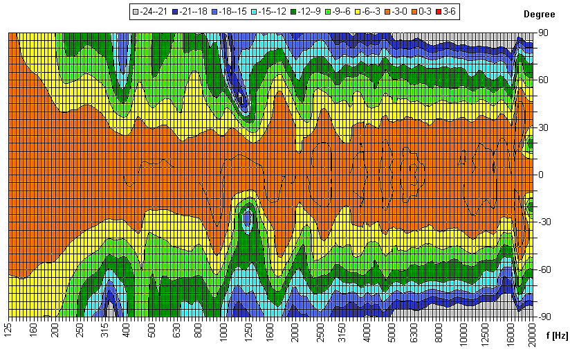 Und dennoch nur ein kleiner Teil der Wahrheit − als dreidimensional abstrahlendes Gebilde ist sein Wiedergabeverhalten sehr viel komplizierter und wird mit der Achsmessung nur unzureichend erfasst. Wünschenswert ist natürlich, dass ein linearer Frequenzgang nicht nur genau vor dem Lautsprecher, sondern über einen bestimmten Winkelbereich aufrecht erhalten wird, um einen größeren Bereich von Zuhörern mit gleichbleibend gutem Sound zu versorgen (oder − bei Heim- und Monitorsystemen − den sweet spot zu verbreitern, in welchem Bewegung möglich ist, ohne den Klanggenuss zu schmälern).