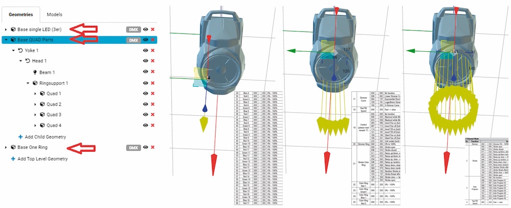 Mehrere DMX-Modi zur alternativen Auswahl einzelner oder Gruppen von Lichtquellen erfordern drei komplette Geometrien und das Zusammenführen über eine Hilfsgeometrie (Bild: Herbert Bernstädt)