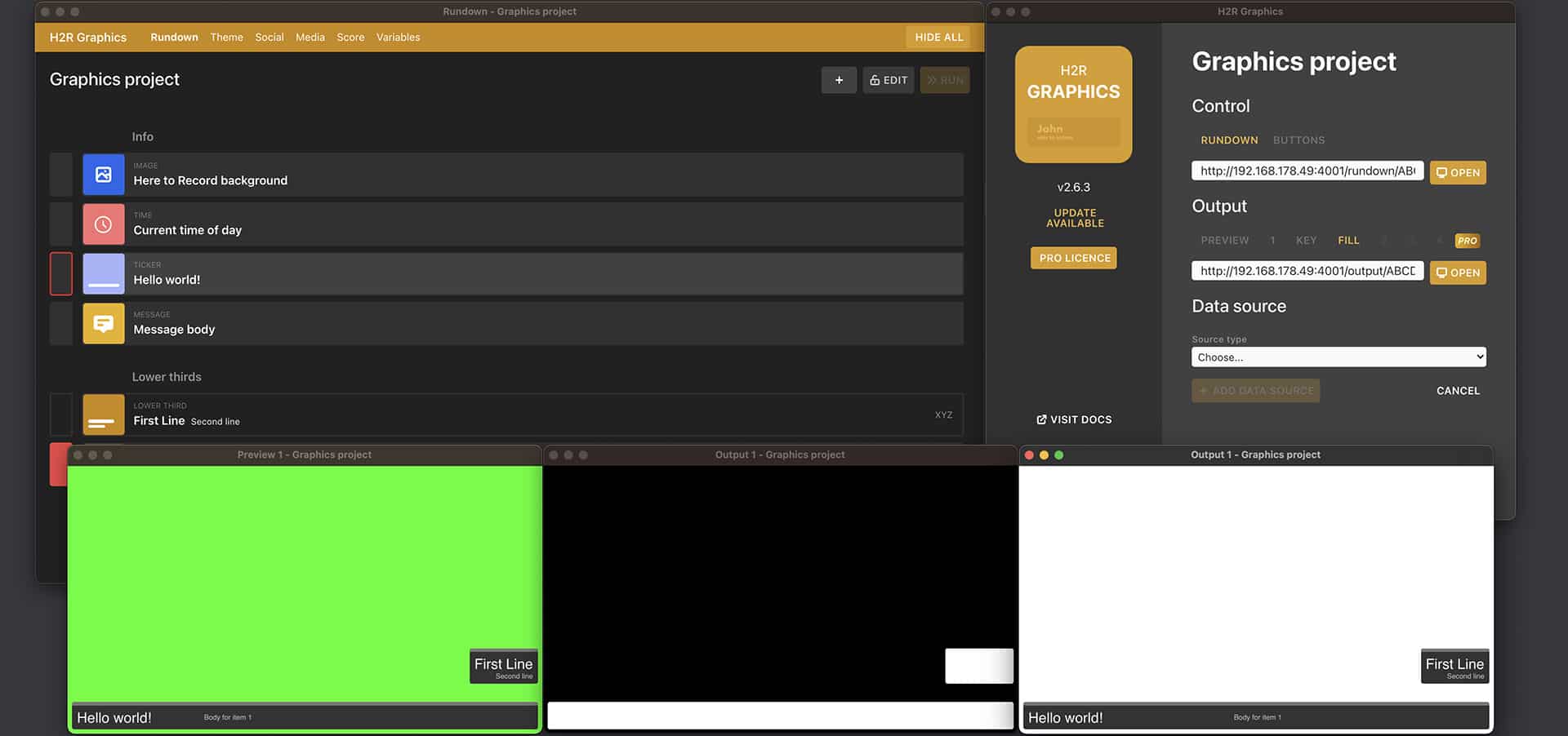 Einfach und preiswert: Die Pro-Lizenz von H2R Graphics kostet 80 US-Dollar für zwei Aktivierungen. Es können Presets angelegt werden, Livedaten verarbeitet werden und es gibt mehrere Ausspielmöglichkeiten. Die kostenlose Version lädt zum Probieren ein und kann bereits für einfache Anwendungen ausreichen. (Bild: Alexander Heber)