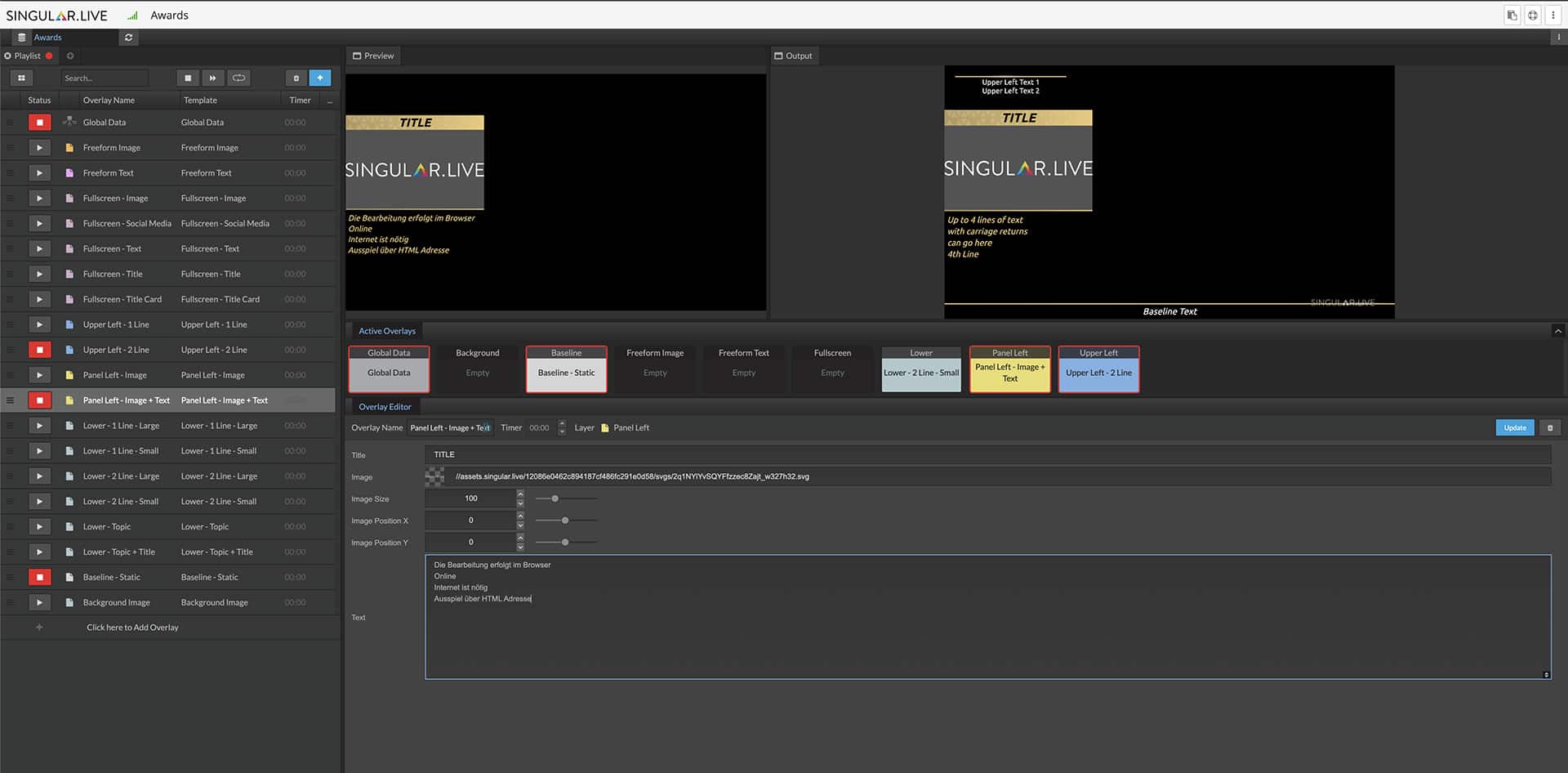 Online-Gestaltung und -Steuerung: Mit Singular.Live wird der Browser zur Medienzentrale. Grafiken, Animationen und Inhalt sind live editierbar und werden über eine einfache Oberfläche ein- und ausgeblendet. Ausgespielt wird über eine URL. (Bild: Alexander Heber)