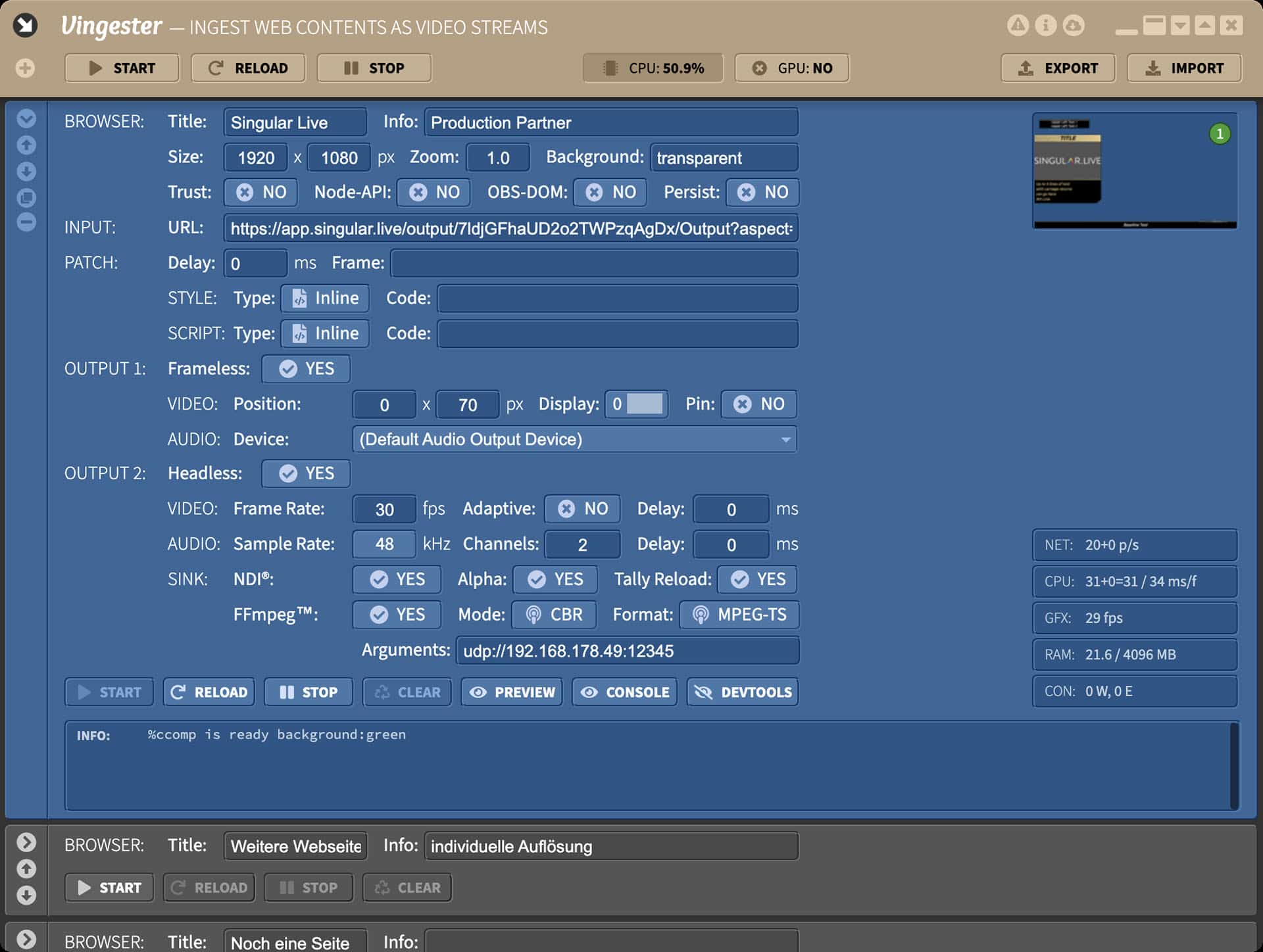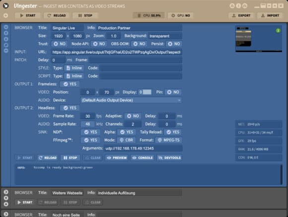Weiterverarbeitung von Web-Inputs: Vingester ist nur ein Beispiel für die Weiterverarbeitung von Grafiken, die per HTML ausgespielt werden. Unter Wahrung des Alphakanals kann das Signal so an NDI-fähige Mischer oder auch Encoder übergeben werden. CasparCG, vMix, Mitti 2 oder auch OBS erlauben die Übersetzung einer Webseite in Key- und Fill-Signal. (Bild: Alexander Heber)