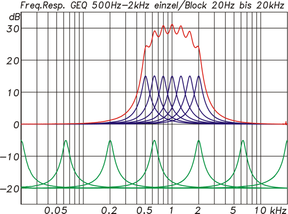 Grafischer EQ des Soundcraft Ui16: oben die Filter von 500 Hz bis 2 kHz einzeln (blau) und im Block (rot)