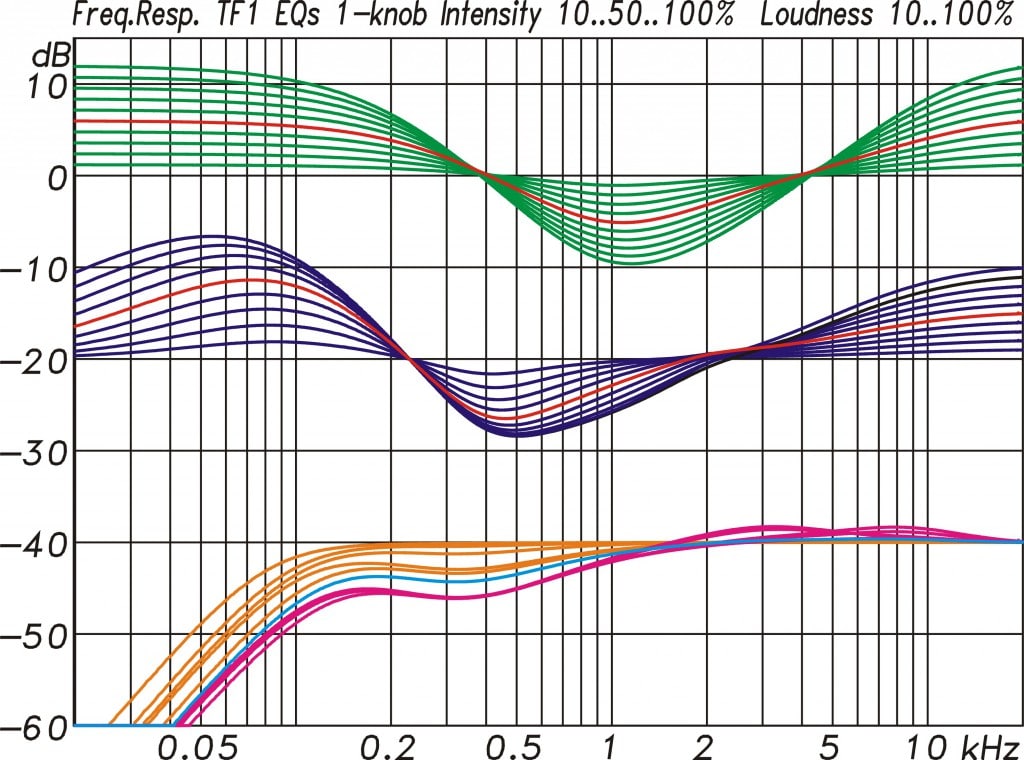 Nicht nur für den Einsteiger interessant dürften die 1-knob Funktionen für die parametrischen EQs sein. Für die Eingänge stehen die Einstellungen „Intensity“ und „Vocal“ zur Auswahl, für die Ausgänge „Intensity“ und „Loudness“. Intensity kann ganz allgemein auf alle Filterfunktionen angewandt werden und staucht oder dehnt eine beliebig eingestellte komplette Filterkurve im Gain. Schaltet man für eine gegebene Filtereinstellung in den 1-knob-Modus, dann bleibt die Kurve zunächst so erhalten und der Intensity-Fader steht auf 50. Für kleinere Werte wird die gesamte Kurve immer flacher und für größere immer stärker ausgeprägt. Bei der Einstellung Intensity = 0 ist das Filter deaktiviert und bei Intensity = 100 in den Gain-Werten verdoppelt. D. h. ein Bell-Filter, das vorher bei +6 dB stand, steht dann bei +12 dB. Die Ausgangseinstellung in unserer Abb. 1 ist die rote Kurve. Die grünen Kurven wurden mit den Intensity-Werten von 10 bis 100 gemessen.