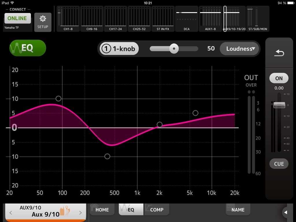 1-knob Modus: Einstellungen für den parametrischen EQ in den Ausgängen in der Einstellung “Loudness” (Bild: Anselm Goertz)