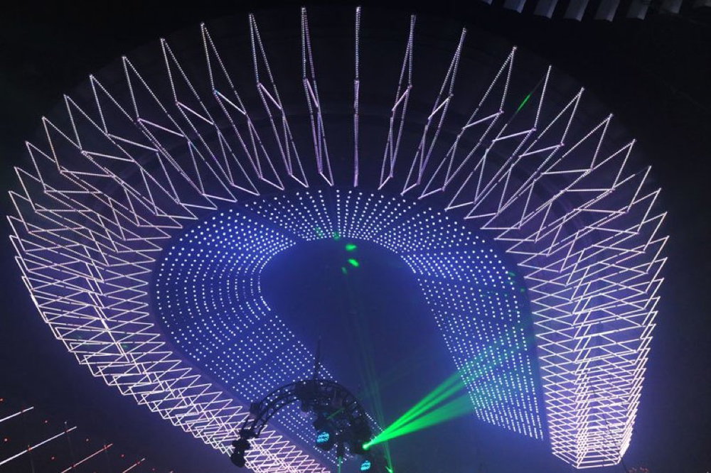 Amsterdam Arena mit der neuen Show „Source Of Light“ mit LED-Streifen, die pro Meter mit 16 W RGB LED-Leistung aufwarten und je 10 cm als ein Pixel anzusteuern sind (Bild: Mittnick.nl/Kevin Verkruijssen)