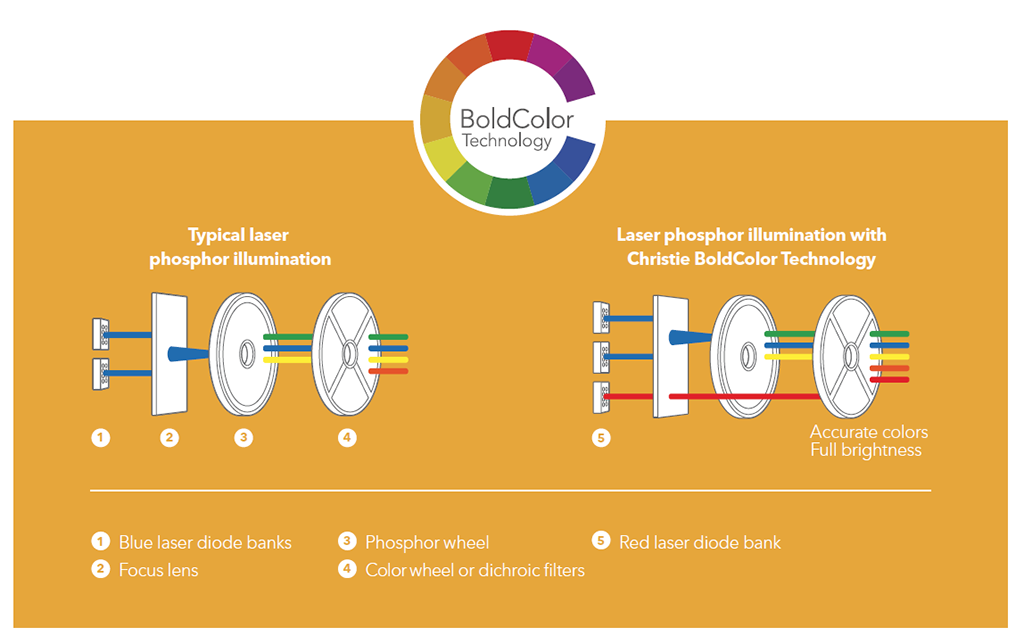 In der 3-Chip-Variante geschieht dies dementsprechend für alle drei Grundfarben separat. Da rotes Licht in diesen Technologien meist am schwächsten abgebildet werden kann, nutzen einige Hersteller – wie zum Beispiel Christie mit ihrer „BoldColor Technologie“ – einen zusätzlichen roten Laser. In Verbindung mit einem speziellen optischen Systemdesign und aufwendigem Videoprocessing lassen sich so höhere Farbwiedergaben und Farbsättigung als bei klassischen Lampenprojektoren erreichen. Aber auch ohne roten Zusatzlaser erreichen Laser-Phosphor-Projektoren den sRGB und Rec.709 Farbraum – und das häufig sogar bei voller Helligkeit.