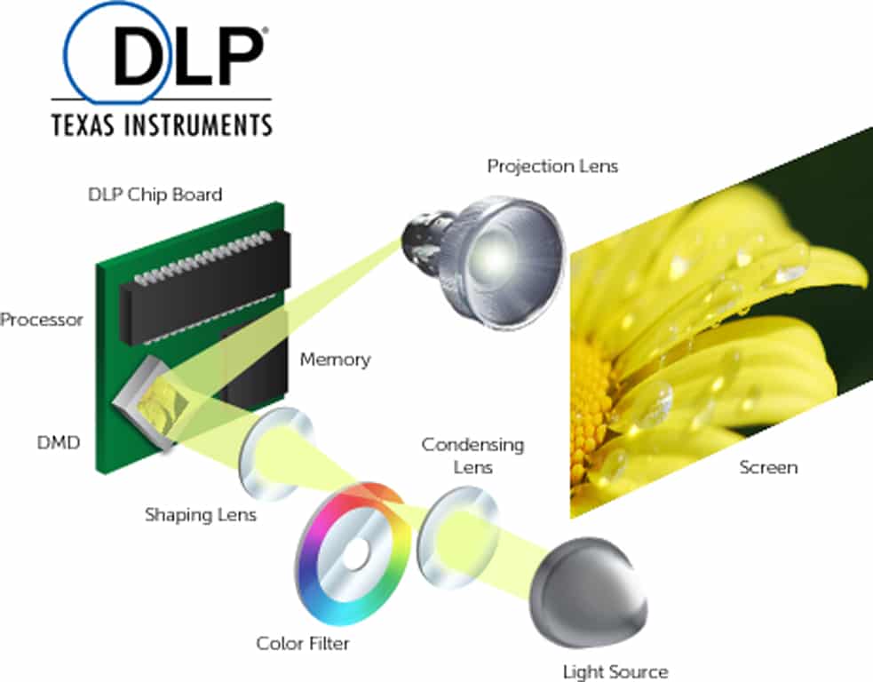 In der weiteren Entwicklung von Lampenprojektoren kam die DLP-Technologie hervor. Hierbei wird ein Chip mit vielen winzigen Spiegeln beleuchtet. Die Helligkeit wird über die Dauer der Beleuchtung geregelt. Bei 1-Chip-Varianten sorgt ein sich sehr schnell drehendes Farbrad und bei 3-Chip-Modellen dichroitische Filter für die Farbgebung. Für schwarze Bildpunkte wird der zugehörige Mikro-Spiegel auf eine absorbierende Fläche ausgerichtet. Heute wird vor allem über verbesserte Farbräder für eine genauere Farbdarstellung und effektivere Lichtausbeute gesorgt. Das Farbrad sorgt allerdings auch für einen Regenbogeneffekt bei schnellen Bewegungen.