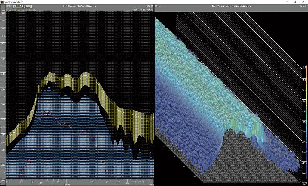 Bei langjährigen Experimenten (als Resident-DJ und Liveact) mit diversen RMS-Zielpegeln und peniblen Vergleichen der beneidenswert gemasterten Lieblingstracks musikalischer Idole und Helden mit den eigenen Produktionen, gewinnt man irgendwann die nötige Ruhe und Sicherheit für spektrale Entscheidungen. Heute cutte ich in der Summe bei ca. 18 Hz mit 12 dB, 24 dB oder 36 dB Flankensteilheit – je nachdem, ob der Bassbereich oberhalb der Einsatzfrequenz durch die Filterung leidet oder davon profitiert. Das sehr genaue Hinhören an diesem Schritt lohnt sich vor allem hinsichtlich des Limiters am Ende der Signalkette, der sonst bei sehr hohen, aber eher „unhörbaren“ Amplitudenspitzen unter 15 Hz in die Knie gegangen wäre und mir das mit nervigem Klirr oder geringer Ziellautheit gedankt hätte. Mehrbändige (ab 80 Bändern wird es spannend) grafische Analyzer mit schneller Ballistik und einer, neben der Anzeige der Spitzenwerte zusätzlich schaltbaren „Average / RMS“-Anzeige sind hierbei heute Pflicht. Auch in Zeiten stark gesteigerter Verstärkerleistungen profitiert jede PA-Anlage, sobald sie zu nah an ihrer Leistungsgrenze arbeitet, von einem bereinigten und klar strukturiertem Infrasub- und Subbassbereich. Trotz omnipräsenter digitaler Schutzschaltungen: Wer ist schon scharf darauf, dass die Anlage dauernd hörbar rauf und runter regelt, nur weil der DJ unbedingt die vom ollen DJM 600 (Ersatzpult!) angebotenen +14 dB in die komplette Sättigung fahren muss, bis sich kein einziges rotes Lämpchen und auch absolut kein Tänzer mehr bewegt.