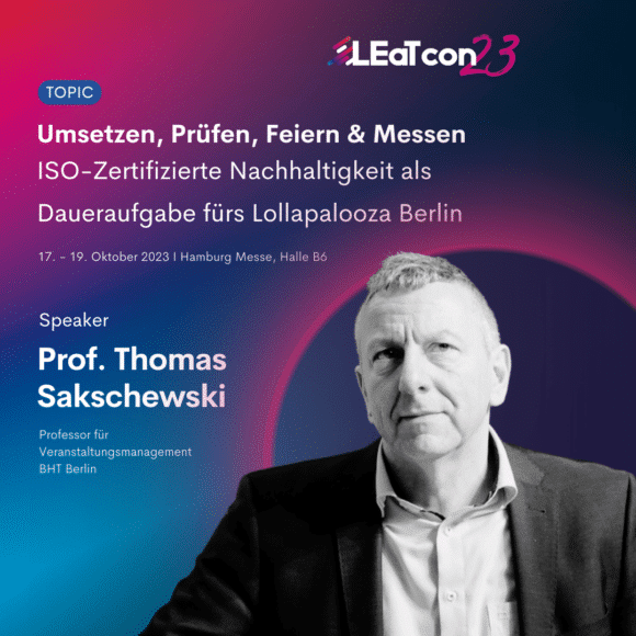 Prof. Thomas Sakschweski wird auf der LEaT con im Oktober in Hamburg zusammen mit der Nachhaltigkeitskoordinatorin Hanna Mauksch und mit Jana Posth (Festivalleitung Lollapalooza) einen Talk über die Forschungsergebnisse der Studien führen. Der 30-minütige Talk findet am 18. Oktober ab 16:00 Uhr in der Messe Hamburg statt.