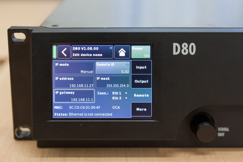 Auf dem Display des Systemverstärkers D80 werden Statusmeldungen auch zum Netzwerk und OCA angezeigt (Bild: Christiane Bangert)