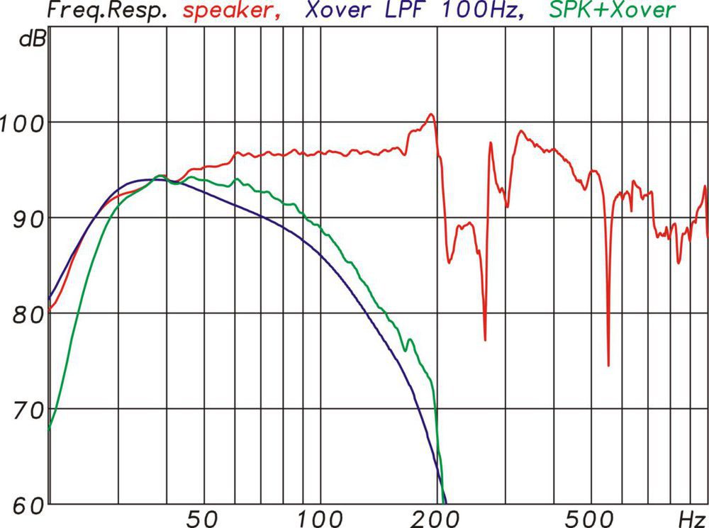 Frequenzgänge der KS28 pur (rot), des Controllers bei 100 Hz Trennfrequenz (blau) und für die KS28 mit Controller (grün) (Abb. 8) (Bild: Anselm Goertz)
