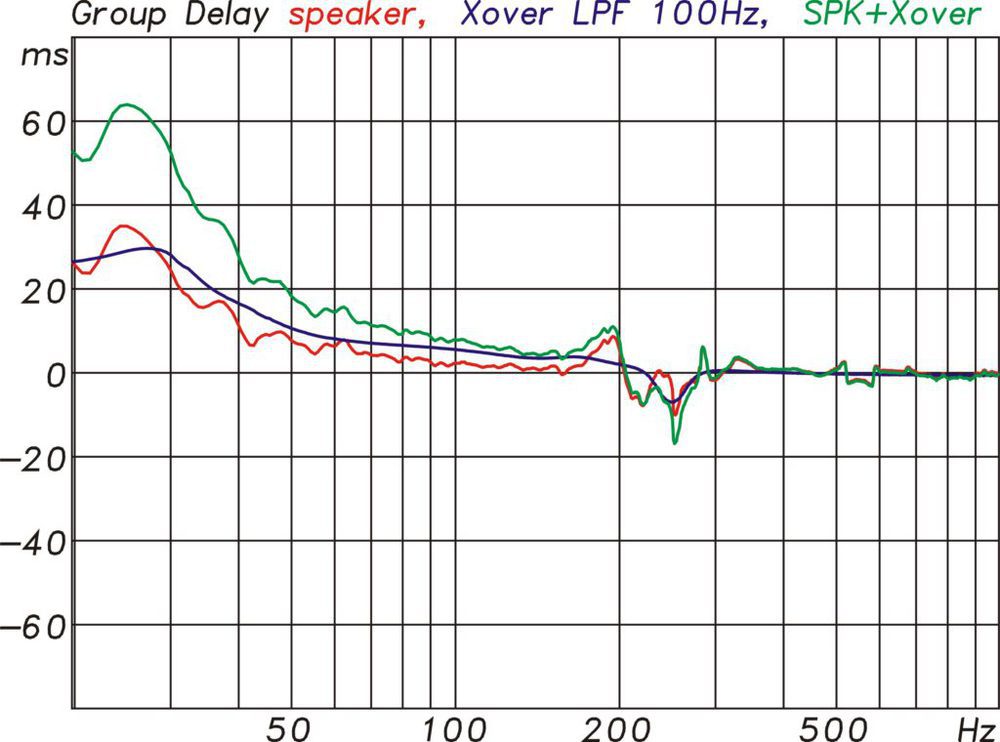 Gruppenlaufzeit der KS28 pur (rot), des Controllers bei 100 Hz Trennfrequenz (blau) und für die KS28 mit Controller (grün) (Abb. 10) (Bild: Anselm Goertz)