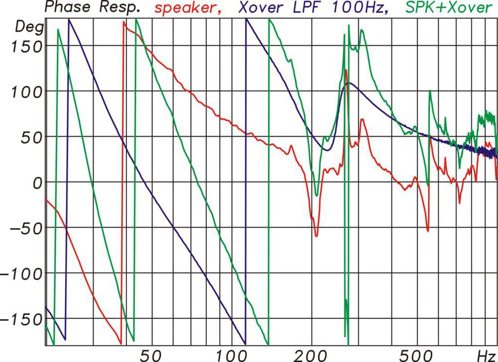 Die zugehörigen Kurven zeigt Abb. 9 in den entsprechenden Farben. Der Lautsprecher verhält sich wie ein Hochpassfilter 4. Ordnung mit 360° Phasendrehung und der Controller bewirkt mit je einem Hoch- und einem Tiefpass 4. Ordnung zweimal 360° Phasendrehung. Beides zusammen bedingt 3 × 360° Phasendrehung im Arbeitsbereich des Subwoofers.