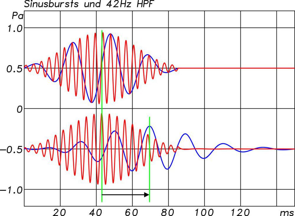 Die hier zu erkennende zeitliche Differenz der Energieschwerpunkte, die durch die Übertragung über das System entsteht, entspricht der Gruppenlaufzeitdifferenz zwischen diesen beiden Frequenzen. Diese Zusammenhänge sind aus der Filtertheorie bedingt und nicht spezifisch für diesen Lautsprecher.