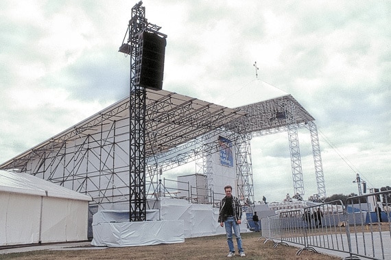 Papst-Besuch 1995 in Paderborn: V-DOSC-Entwickler Christian Heil vor den Line-Arrays, die Westfalensound weltweit salonfähig machten (Bild: Detlef Hoepfner)